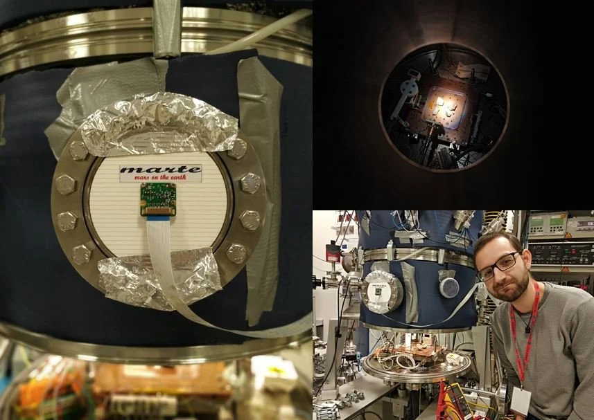 Clockwise from left: exterior view of the MARTE Mars environmental chamber at the Centro de Astrobiologia; overhead view of University Valley cryptoendolith samples within the MARTE interior; co-author Miguel Ángel Fernández-Martínez standing next to MARTE.