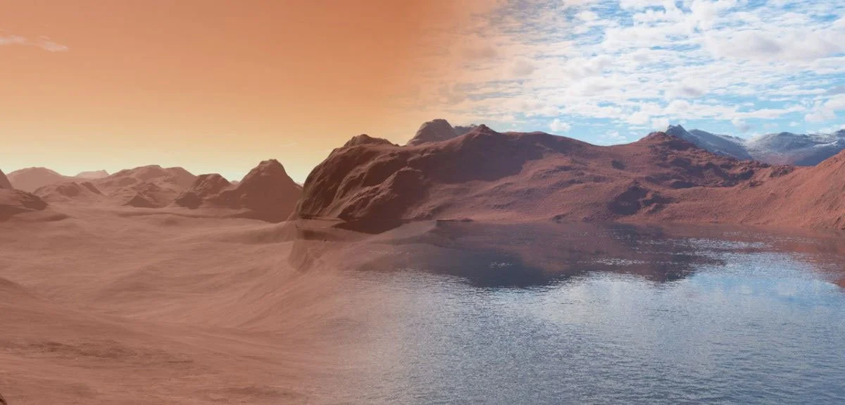An artist’s impression of the current Martian surface (left) and what parts of Mars may have looked like ~4 billion years ago (right). Credit: Jon Wade.