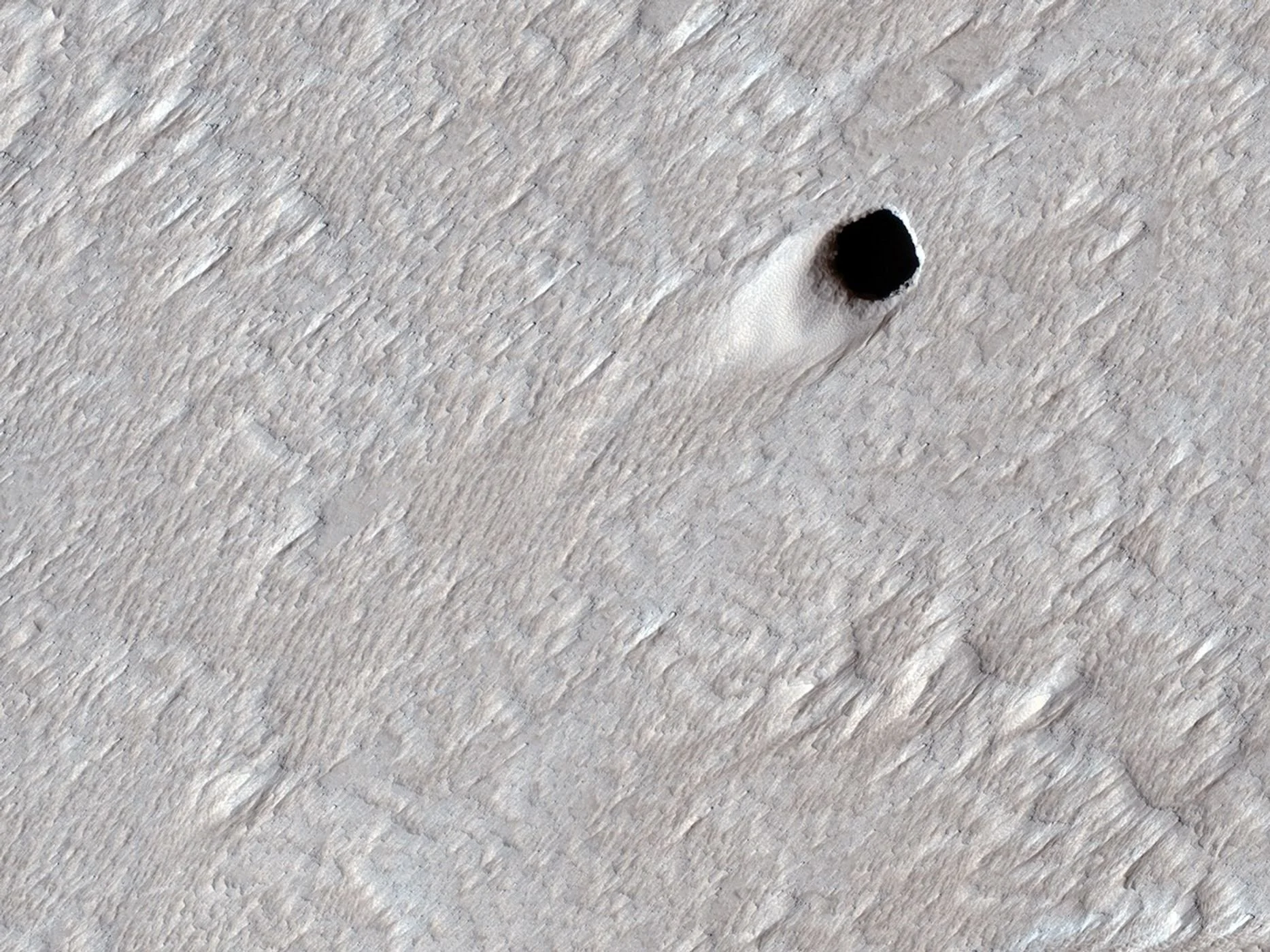 A lava tube opening in Arsia Mons on Mars.